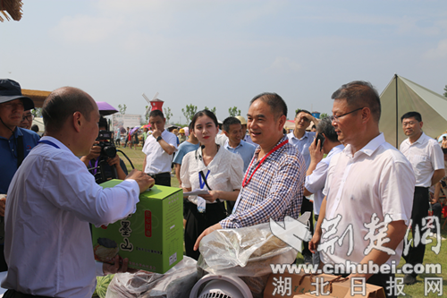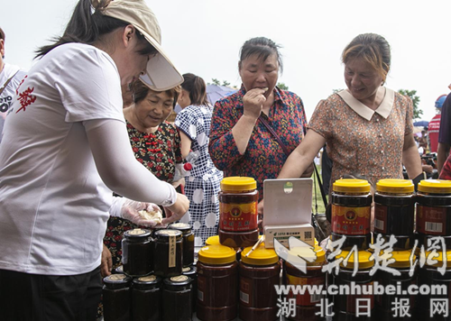以旅会友,以节联商。活动现场,12个“一镇一品”主题馆里,冷集的黄桃、盛康的酱煲肉、开发区的葵花油、赵湾的香菇木耳……各具特色的农产品聚集展会,吸引许多游客驻足购买。盛康镇柳铺村村民任玉琴,家里几代传承生产柳铺豆瓣酱,烹制的酱煲肉、黄焖土鸡香飘十里,声名远播。