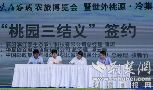 冷集首届黄桃节包含“美在桃乡”摄影展、“乐在桃乡”互动体验、“购在桃乡”线上直播三大主题活动。开幕式上,桃商、电商、物流三方正式签署合作协议,上演现代版“桃园三结义”,以此打通网络销售渠道,提升冷集黄桃的品牌影响力,共同助力农民增收、农业增效。