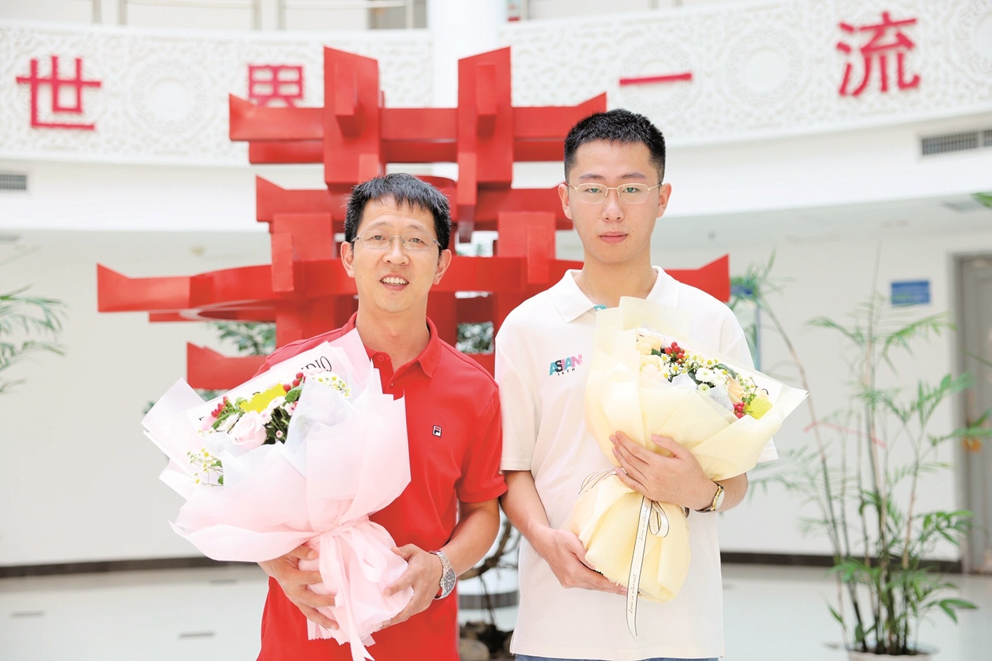 余文凯(右一)和班主任方钢老师 通讯员供图