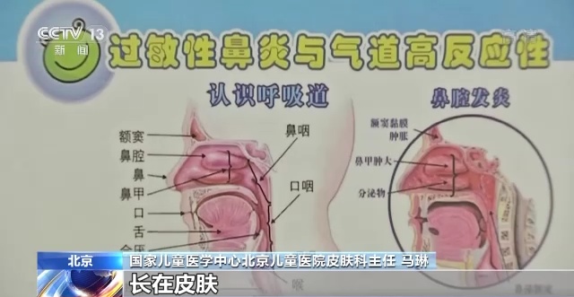 国家儿童医学中心北京儿童医院皮肤科主任 马琳:人就没有单一的病,长在皮肤,其实是全身这些过敏性疾病在皮肤的表现,食物蛋白过敏、过敏性鼻炎、过敏性哮喘,还有过敏性结膜炎,这几个他们叫过敏家族病,而过敏家族病的第一个表现是特异性炎,意味着它是窗口,所以如果皮肤管好了,后边的哮喘、过敏性鼻炎、过敏性结膜炎就可以不发生或者病症也轻。