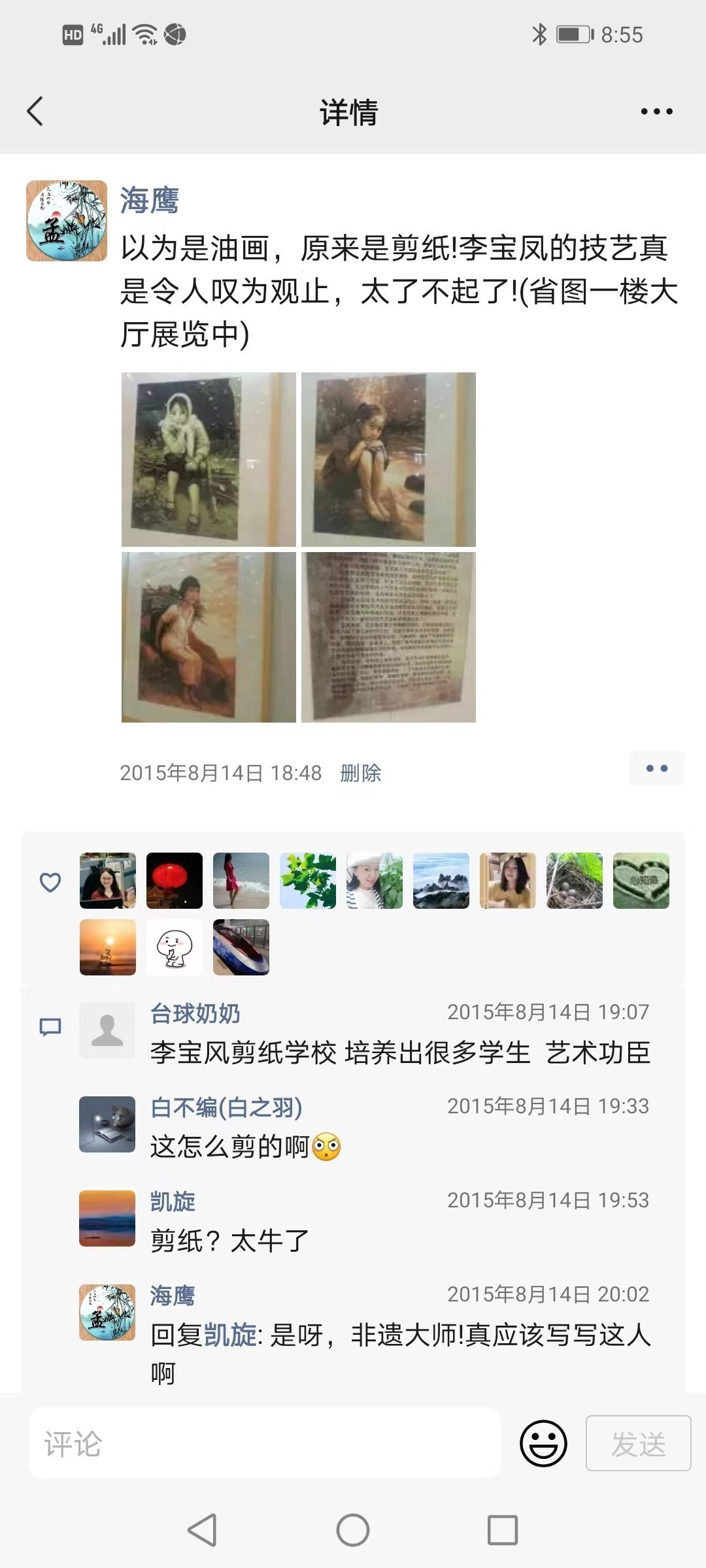 第一次看到李宝凤的剪纸是七年前在吉林省图书馆一楼展示大厅,十分震撼,不禁发了条朋友圈“以为是油画,原来是剪纸,叹为观止”。