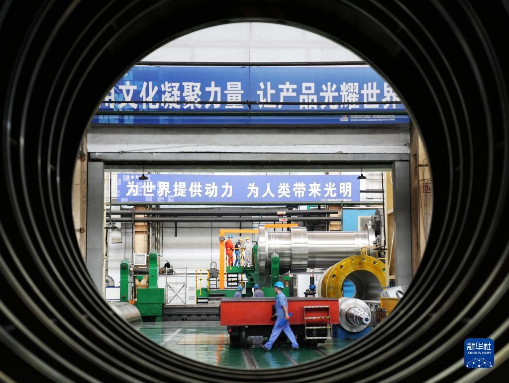 6月27日,在哈电集团哈尔滨电机厂有限责任公司车间,工人在进行生产作业。