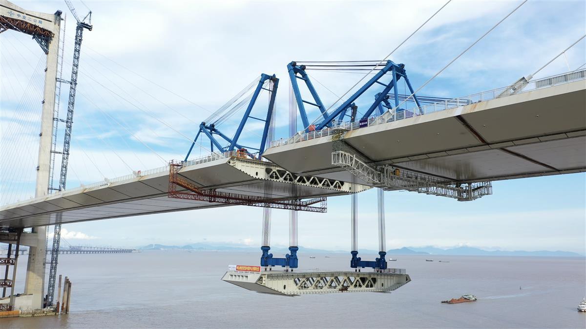 中铁大桥院副总经理张强介绍,中山大桥的钢箱梁,是目前世界上最宽的整幅跨海斜拉桥钢箱梁,给整个“搭积木”过程带来了一系列新的挑战和风险。中铁大桥院设计团队积极协调各参建单位讨论研究,经过反复比选,最终共同决定采用“斜拉索预张和主梁分阶段焊接技术”。