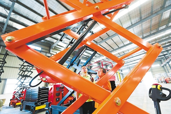 ▶湖北脉辉金茂机械有限公司(京山)员工在装配出口法国的液压机械车辆。 (湖北日报全媒记者 张鸿 通讯员 余舟 赵鹏飞 摄)