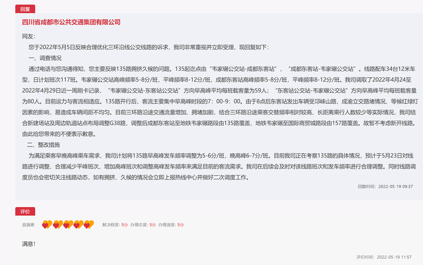 此外,成都市公共交通集团有限公司还对网友反映的问题,给出了整改措施:为满足乘客早晚高峰乘车需求,公司计划将135路早高峰发车频率调整为5-6分/班,晚高峰6-7分/班。此外,成都市公共交通集团有限公司还回复,将考察135路的具体情况并对线路进行调整,合理减少平峰班次、增加高峰班次和调整高峰发车频率来满足目前的客流需求。在后续会也及时对该线路班次和发车频率进行合理调整。同时线路调度员也会密切关注线路动态,如有拥挤、久候的情况会立即上报热线中心并做好二次调度工作。