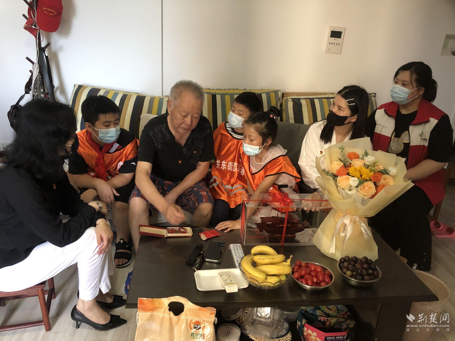 荆楚网(湖北日报网)讯(通讯员 金婵 潘婷)“爷爷,我们来看您啦!”6月30日,在东湖高新区关东街道举办的“大手牵小手,童心向党迎‘七一’”主题实践活动中,小志愿者们在八一社区党员的陪同下,来到老党员李建国家中,送去亲手制作的礼物,听老人分享革命故事,让“红船精神”薪火相传。