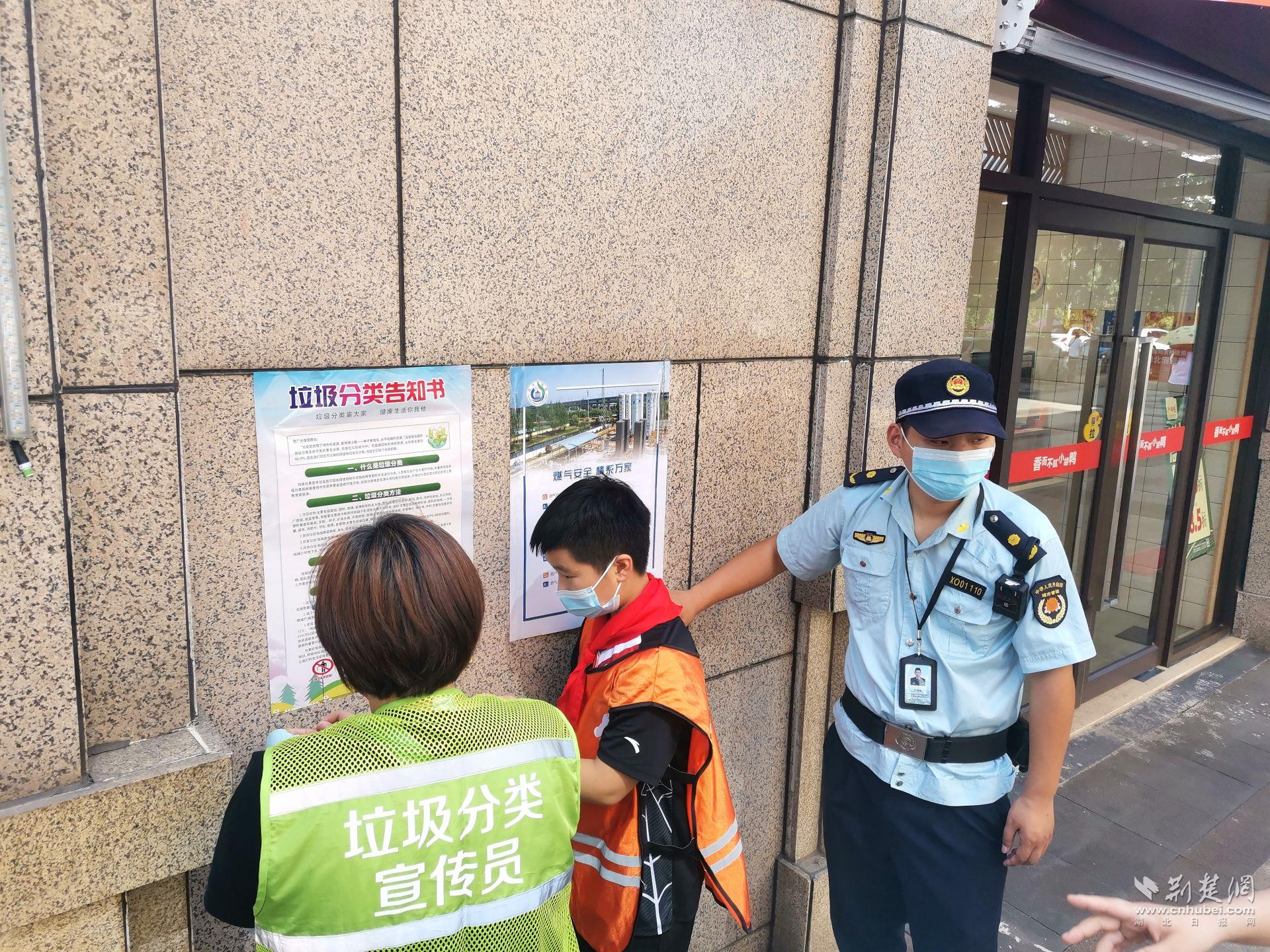 看望完老人后,小志愿者们在步行街城管中队队员和垃圾分类工作人员带领下,走进商铺发放宣传单、张贴海报、体验垃圾分类智能设备,通过志愿服务切实践行“红船精神”。