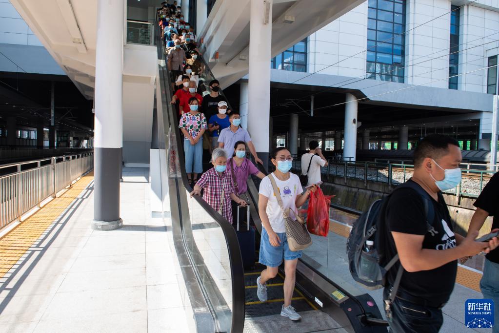 7月1日,在株洲火车站站台,旅客准备乘车。