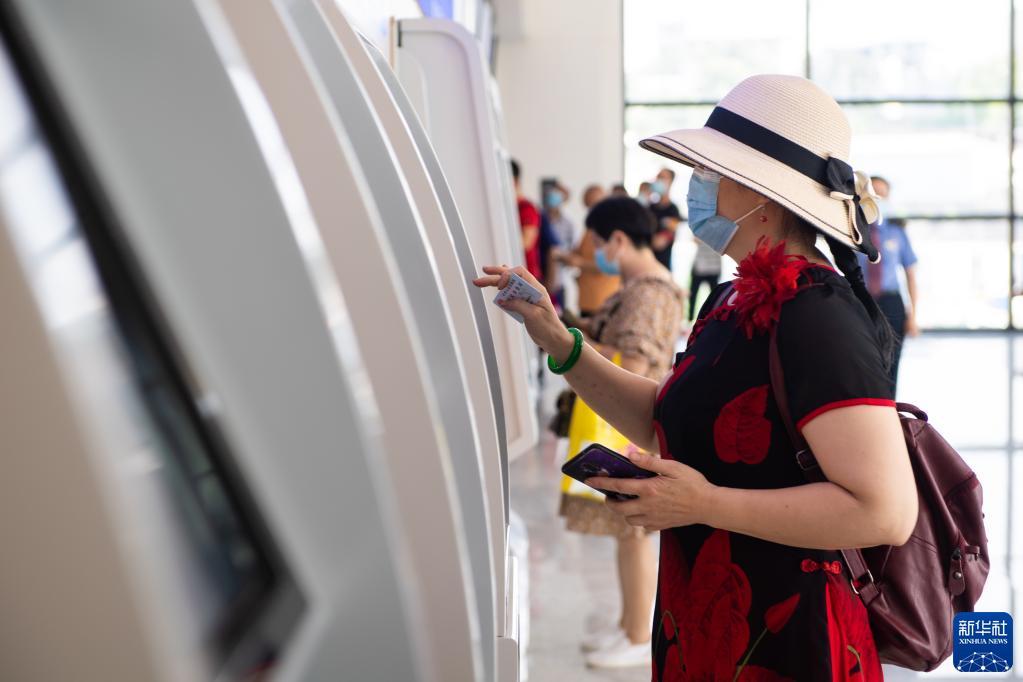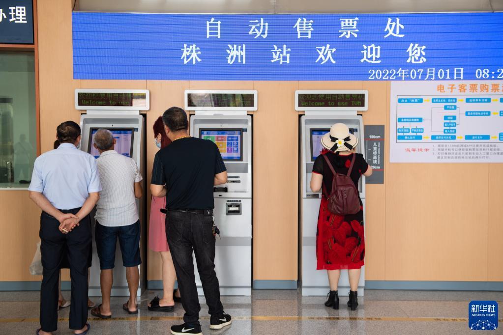 7月1日,在株洲火车站售票处,旅客通过自动售票机购票。