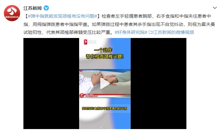 【弹中指就能发现颈椎有没有问题】检查者左手轻握患者腕部,右手食指和中指夹住患者中指,用拇指弹拨患者中指指甲盖。如果弹拨过程中患者其余手指出现不自觉抖动,则视为霍夫曼试验阳性,代表其颈椎部脊髓受压比较严重。