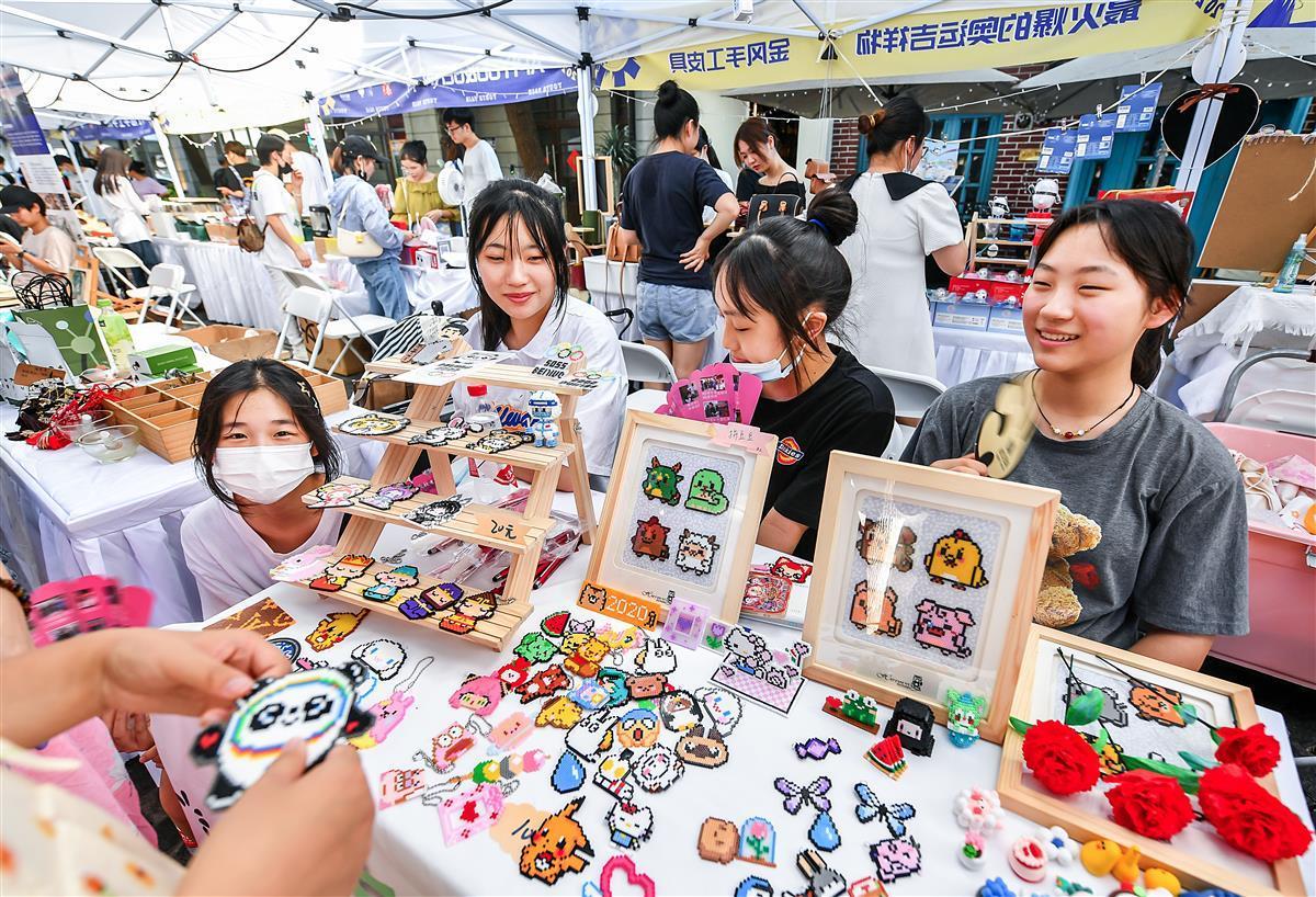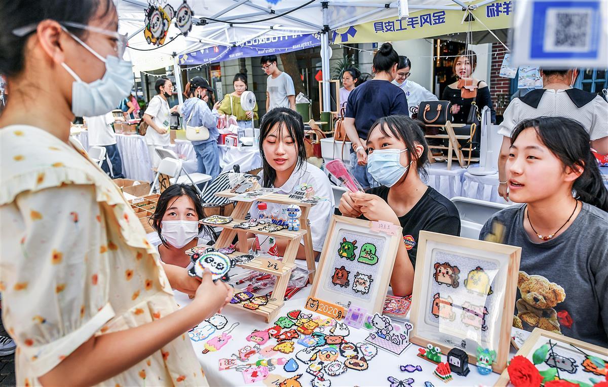 7月1日下午,武汉市黎黄陂路步行街人声鼎沸、火红的太阳放出耀眼的光芒,没有浇灭年轻人“赶集”的热情。他们边品尝美味小吃,边欣赏纤维艺术画、木制漆盘等各类特色手工艺品,逛热闹市集。