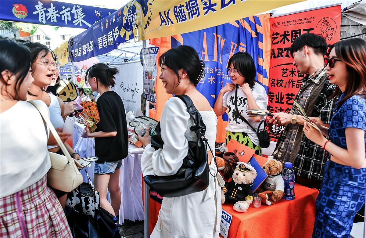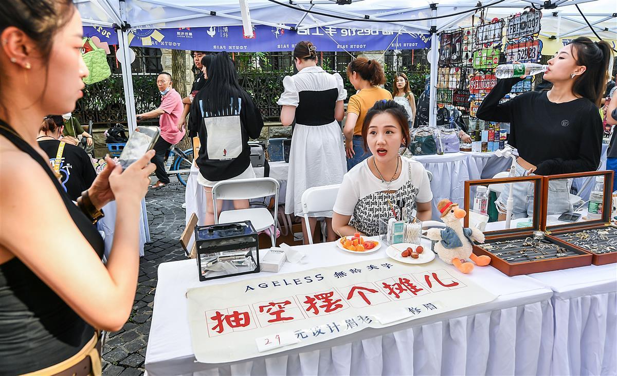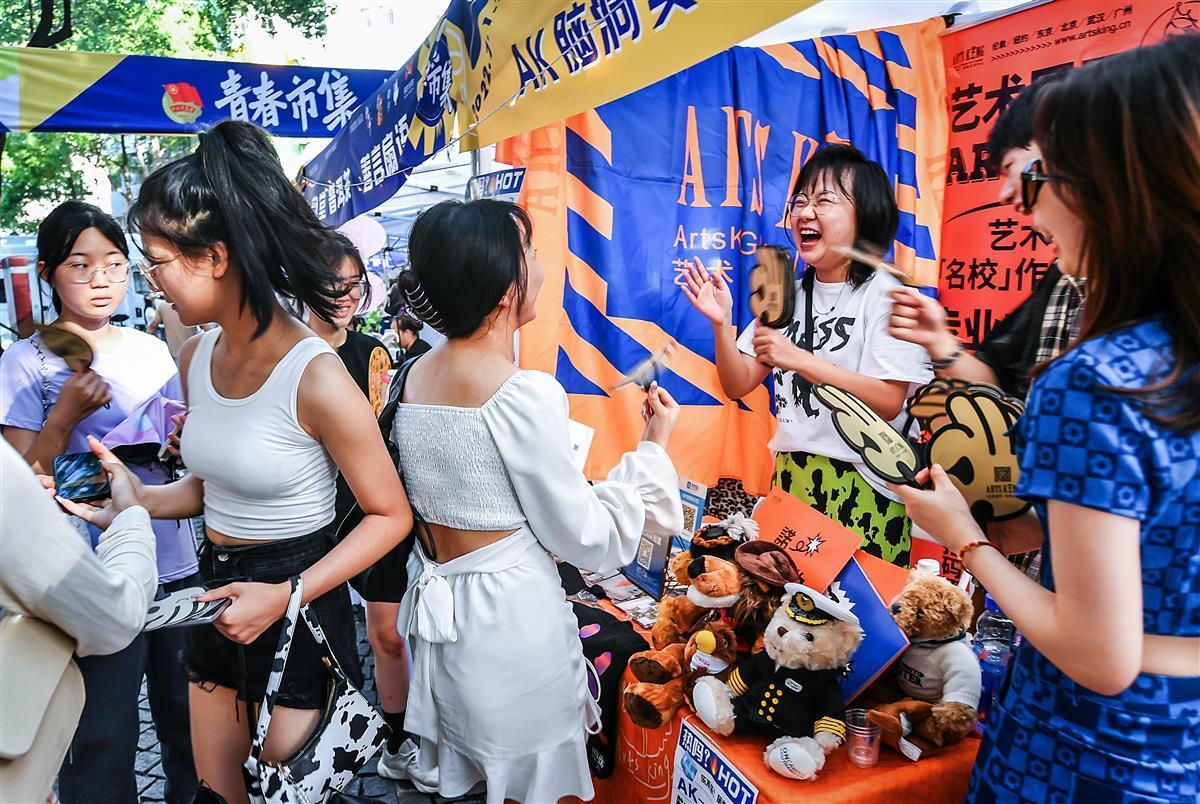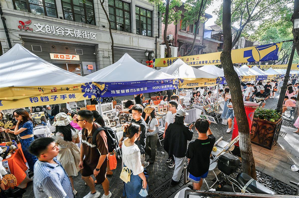 连日来,一场场热闹欢快的“青春市集”在武汉市这条步行街上演。来自武汉三镇的网红店主、青年艺人、文创达人、手工匠人在现场摆出140多个“快闪”摊位,推出特色产品,展示青春才艺,带动社会消费,服务城市青年。(湖北日报全媒记者朱熙勇 摄)