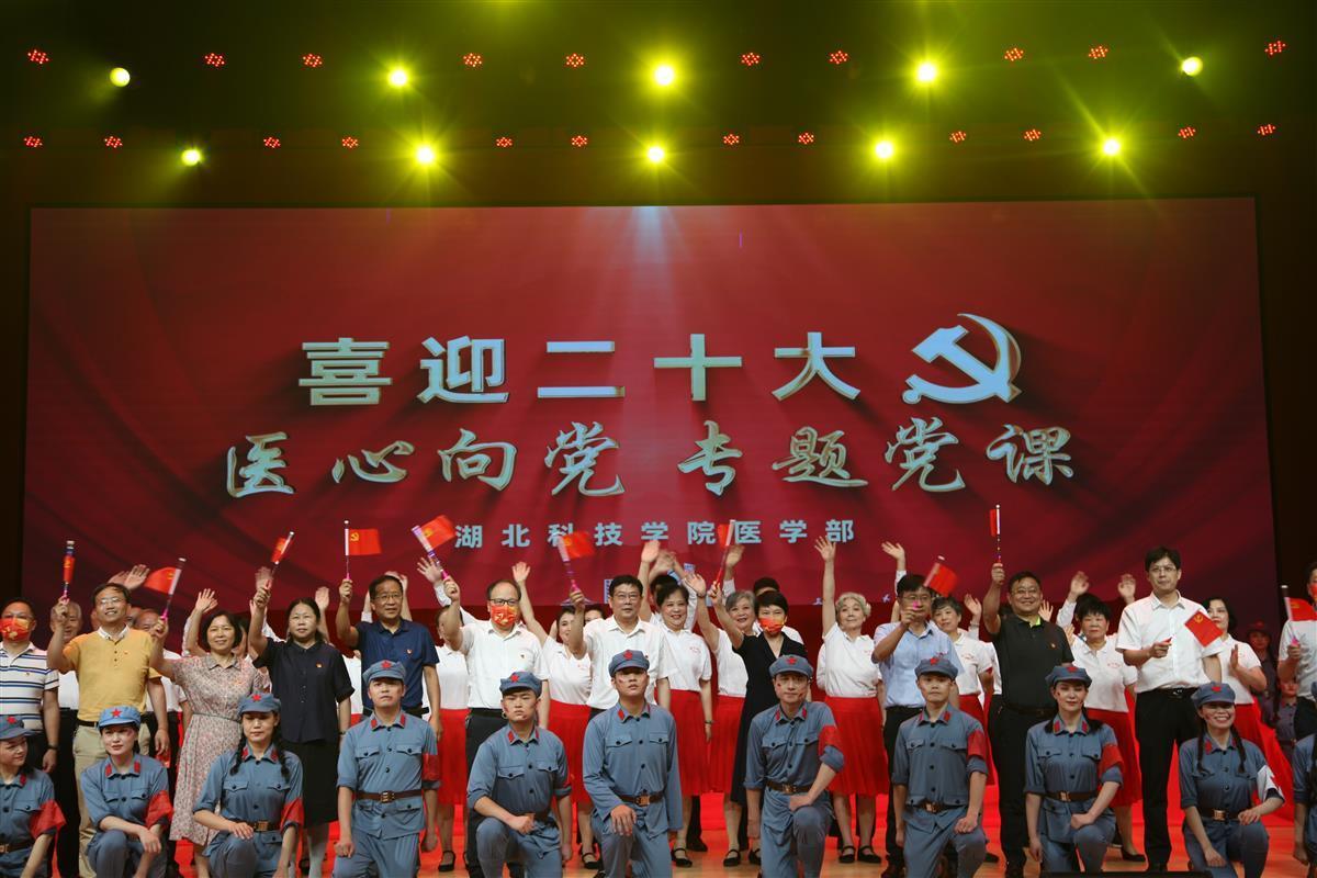 党课在《宣誓》中拉开帷幕。情景剧《翻越雪山》和《穿越沼泽》把发生在长征途中的一个个感人至深的故事呈现在大家面前。舞台剧《留下来》表达了医学生愿意追寻“咸医人”的脚步,为湖科医学教育贡献自己的青春力量。随后,一群平均年龄70岁的湖科退休教职工唱响《医学部·少年》,将气氛推向高潮。时长一小时的专题党课高潮迭起,在全场合唱《没有共产党就没有新中国》中落下帷幕。