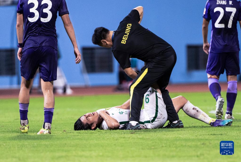 7月3日,北京国安队球员张玉宁(中)在比赛中抽筋倒地。新华社记者 王冠森 摄