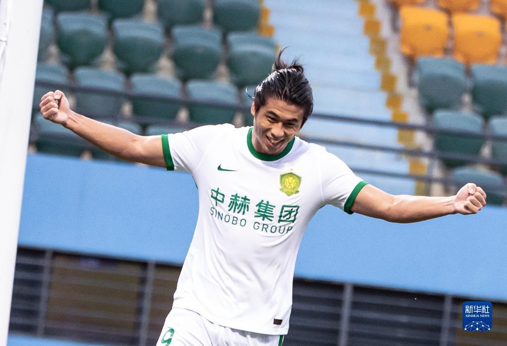7月3日,北京国安队球员张玉宁(上)在比赛中庆祝。新华社记者 王冠森 摄