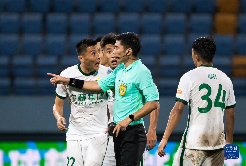 7月3日,北京国安队球员于大宝(左)向主裁判麦麦提江·艾合麦提表达不满。新华社记者 王冠森 摄