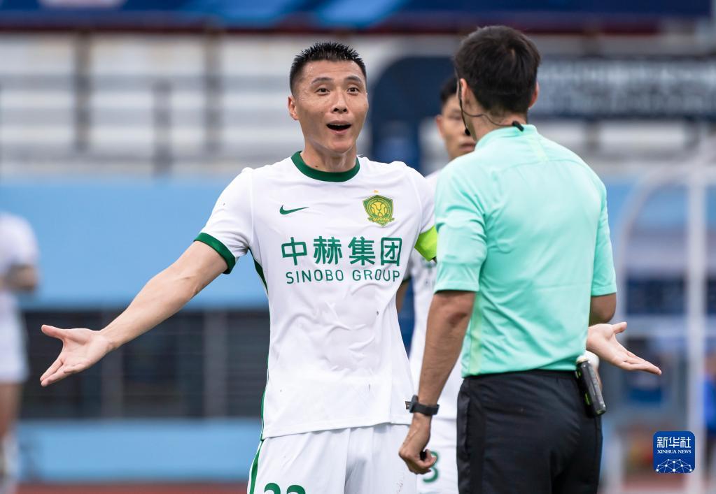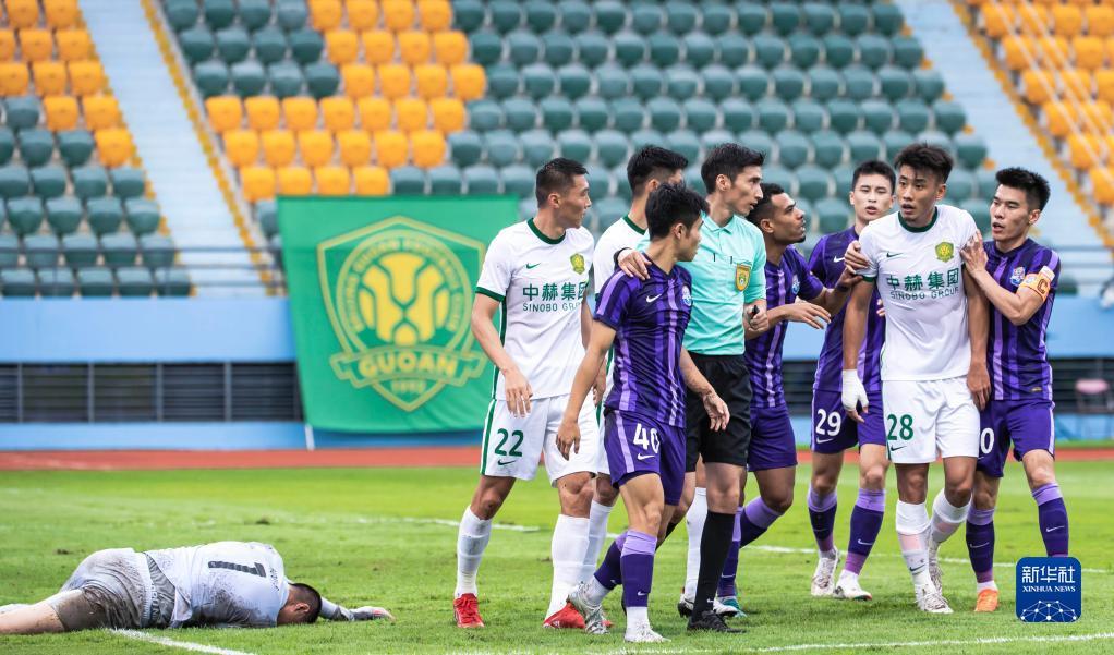 7月3日,北京国安队球员对本队守门员被侵犯表示不满。新华社记者 王冠森 摄