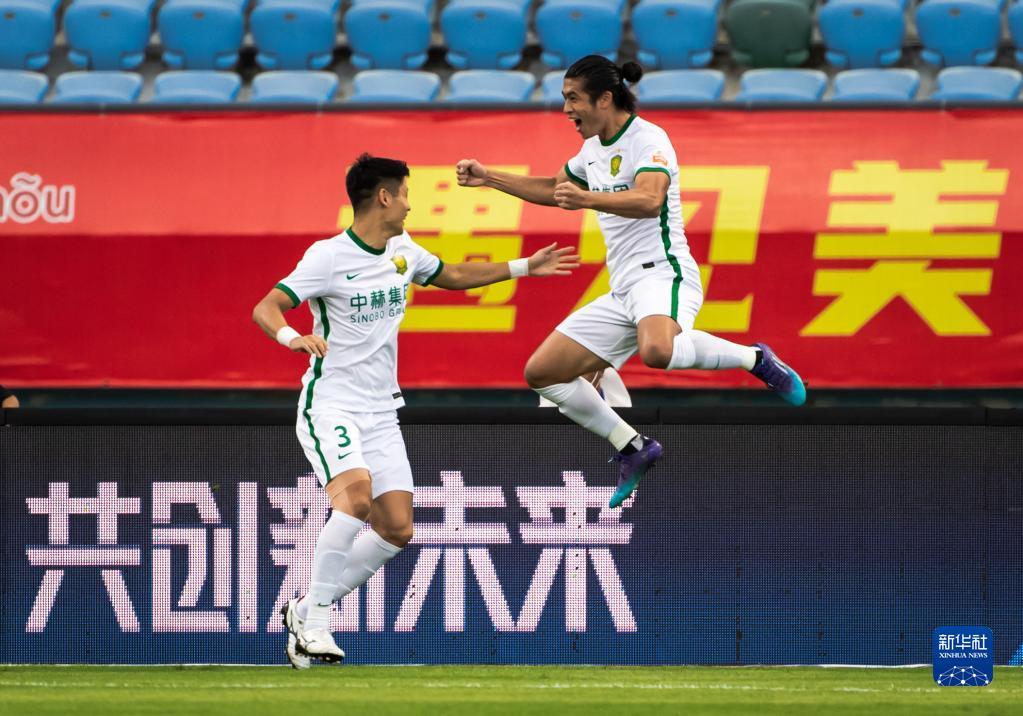 7月3日,北京国安队球员在比赛中庆祝进球。新华社记者 王冠森 摄