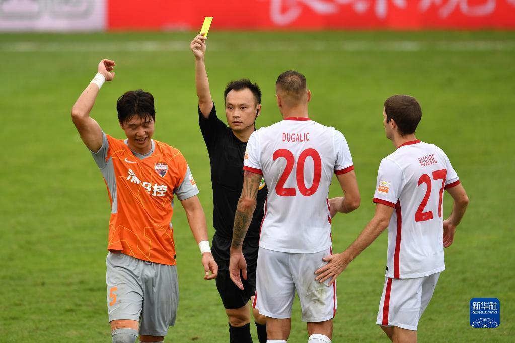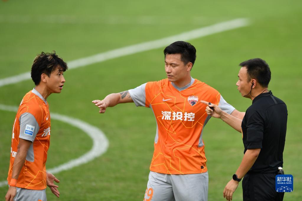 7月3日,主裁判王竞(左二)向深圳队球员林采民(左一)出示黄牌。新华社记者 陈振海 摄