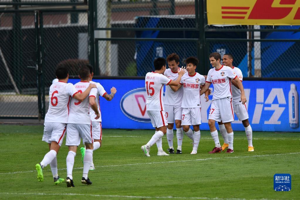 7月3日,梅州客家队球员在进球后庆祝。新华社记者 陈振海 摄