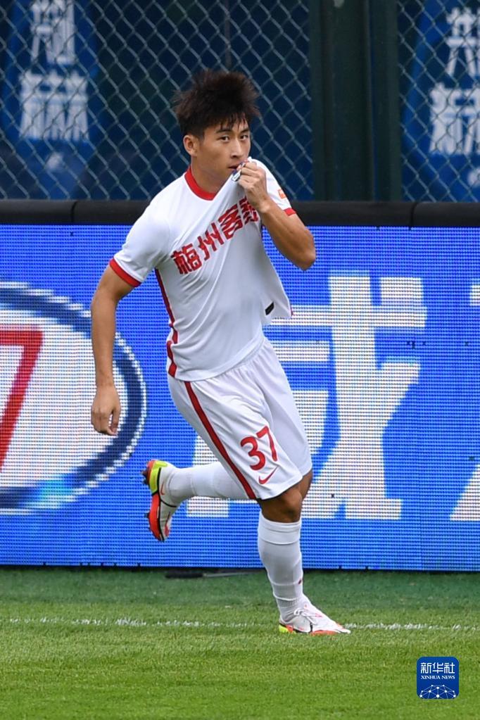 7月3日,梅州客家队球员陈国抗在进球后庆祝。新华社记者 陈振海 摄