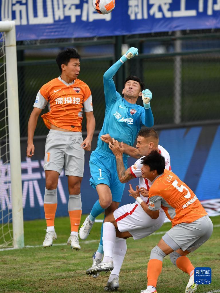 7月3日,深圳队守门员张鹭(左二)在比赛中扑救。新华社记者 陈振海 摄