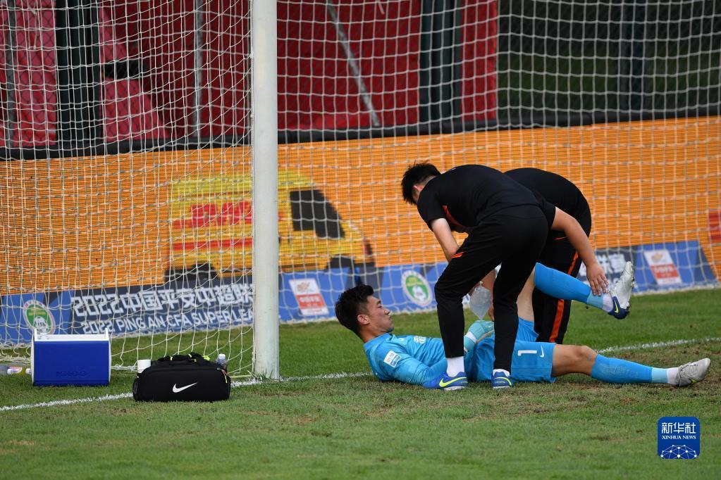 7月3日,队医在查看深圳队守门员张鹭的伤势。新华社记者 陈振海 摄