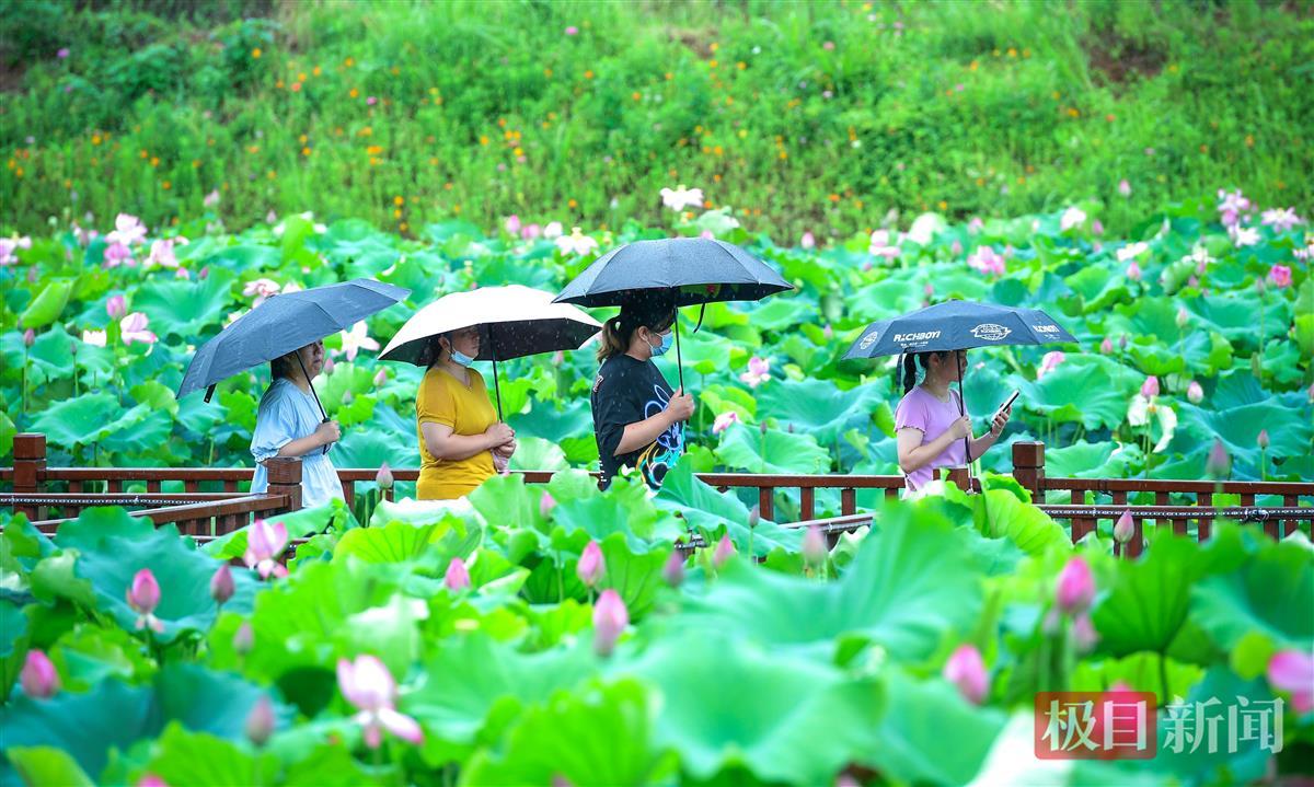 极目新闻记者在现场看到,还有游客特意装扮一番前来打卡,有穿着一袭白色纱裙的,有身着旗袍的,还有穿着汉服的,绵绵细雨挡不住热情的游客。游客曾先生当天从咸宁驱车一个半小时赶来参加荷花节,“朋友向我发出邀请,得知有荷花节,我们一起约了几个朋友来的。这里的荷花很美啊。”曾先生说。
