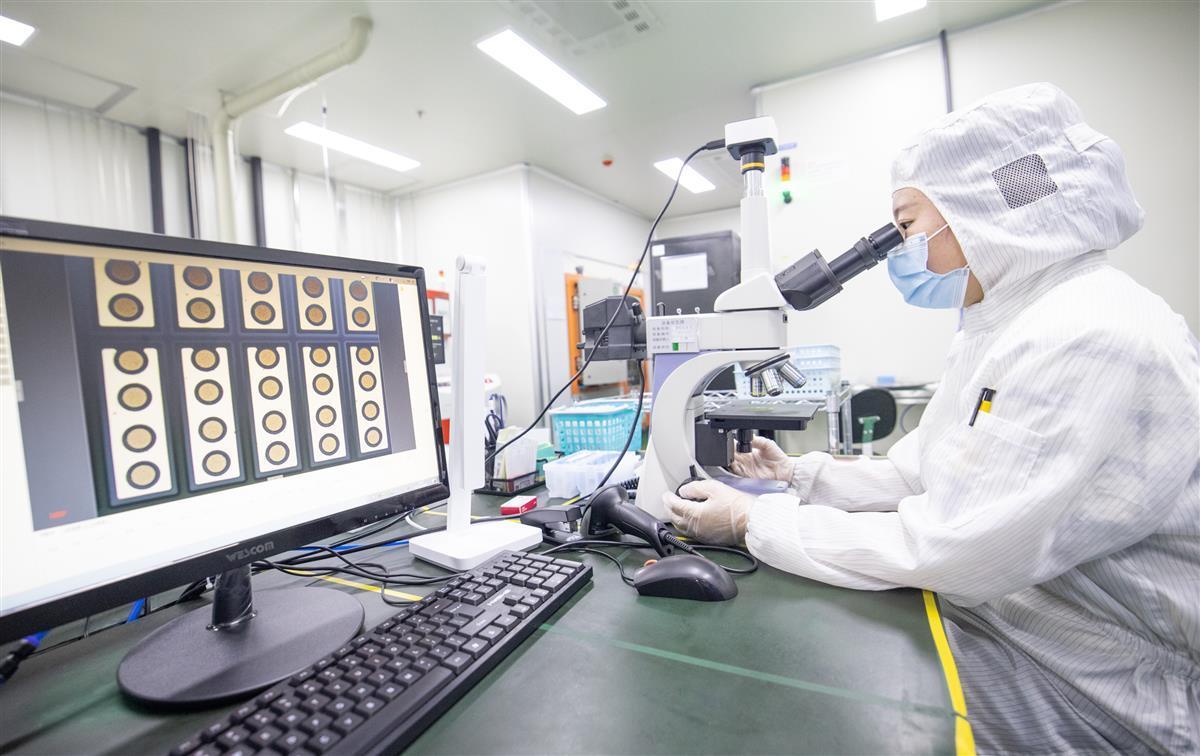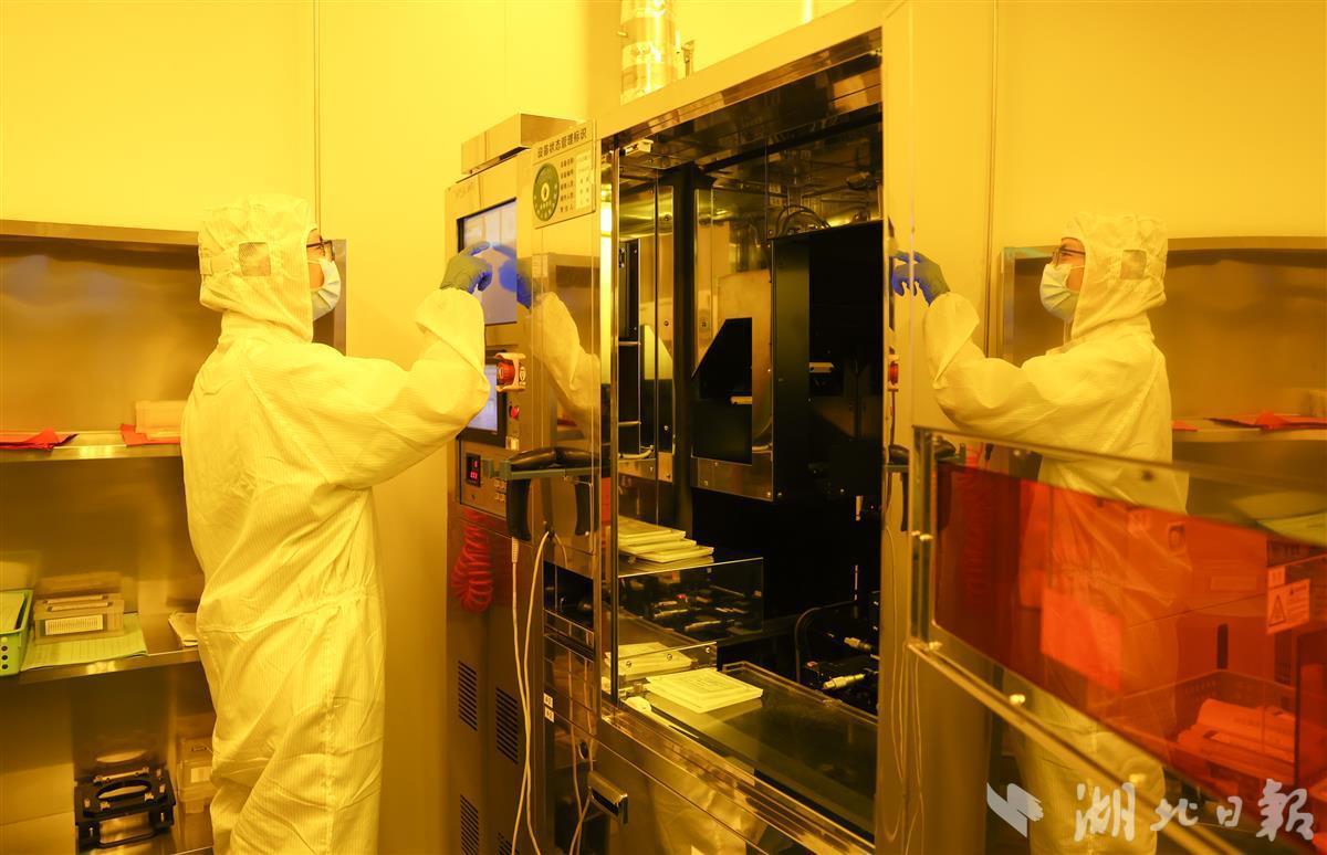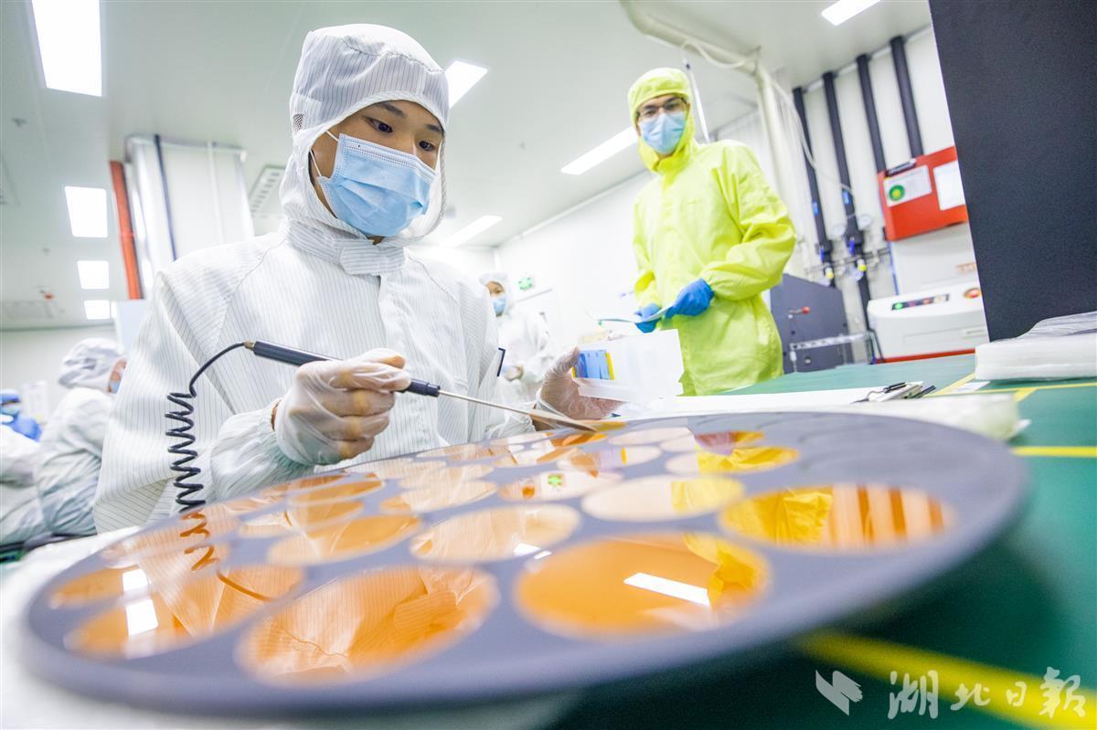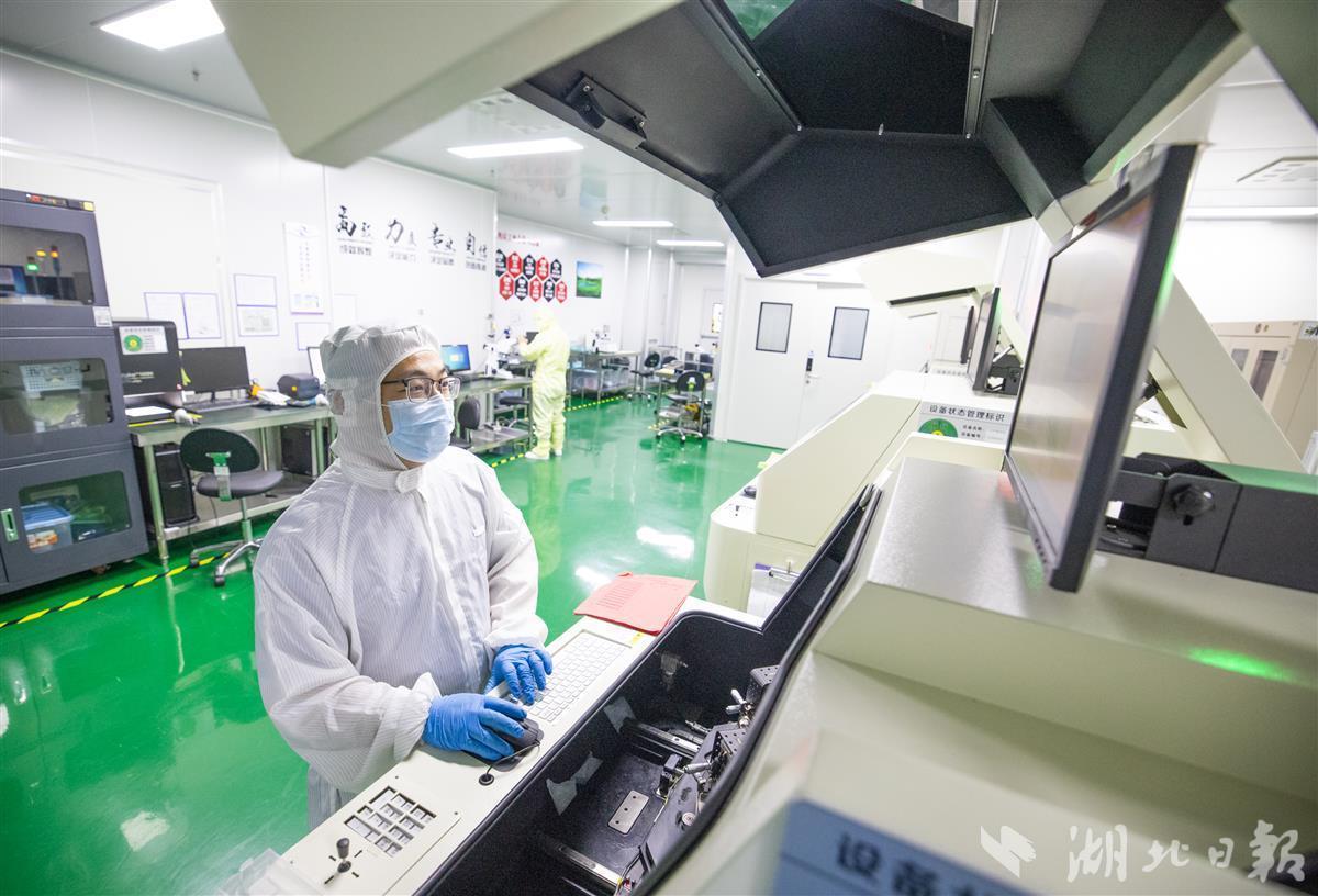7月4日,技术人员在湖北深紫科技有限公司无尘车间赶制订单。该公司与华中科技大学共建企校联合创新中心,长期致力于UVC芯片技术开发,产品主要应用于公共卫生杀菌领域等。近期,公司研发团队成功实现了UVC大功率芯片技术突破,研制出单颗光输出功率140mW以上的大功率芯片。据介绍,该产品技术性能的突破,将助力深紫科技在国际市场上名列前茅。目前,该款产品已进入批量供货阶段。
