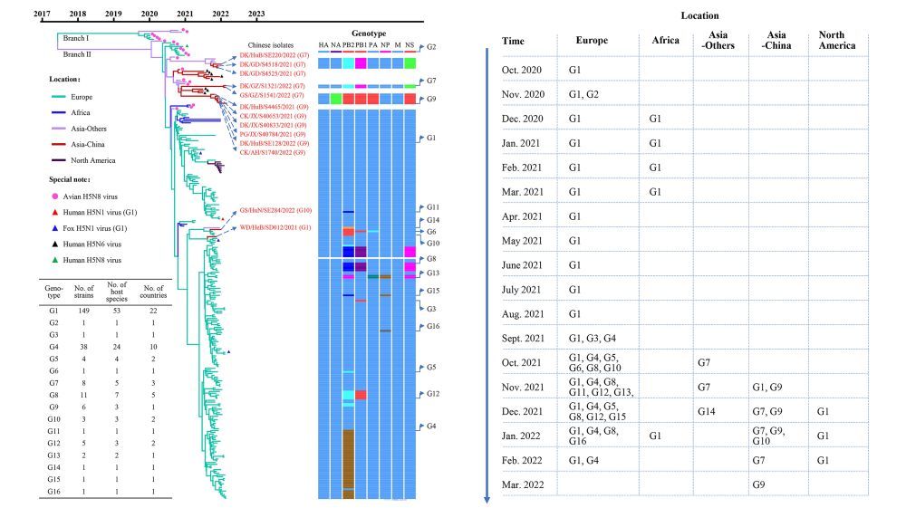 2021年9月至2022年3月,设立在哈尔滨兽医研究所的国家禽流感参考实验室在全国范围内采集了26767份野鸟和家禽样品,从中分离到13株H5N1病毒。为探究这些新传入我国的H5N1病毒的来源,研究人员对全球233株H5N1亚型代表毒株进行了系统的遗传演化和时空传播分析,发现目前全球流行的H5N1病毒自2020年10月首次在欧洲国家出现以来,在自然界中与多种野鸟源禽流感病毒进行了复杂的基因片段重配,形成了16种不同的基因型。我国监测到4种基因型。