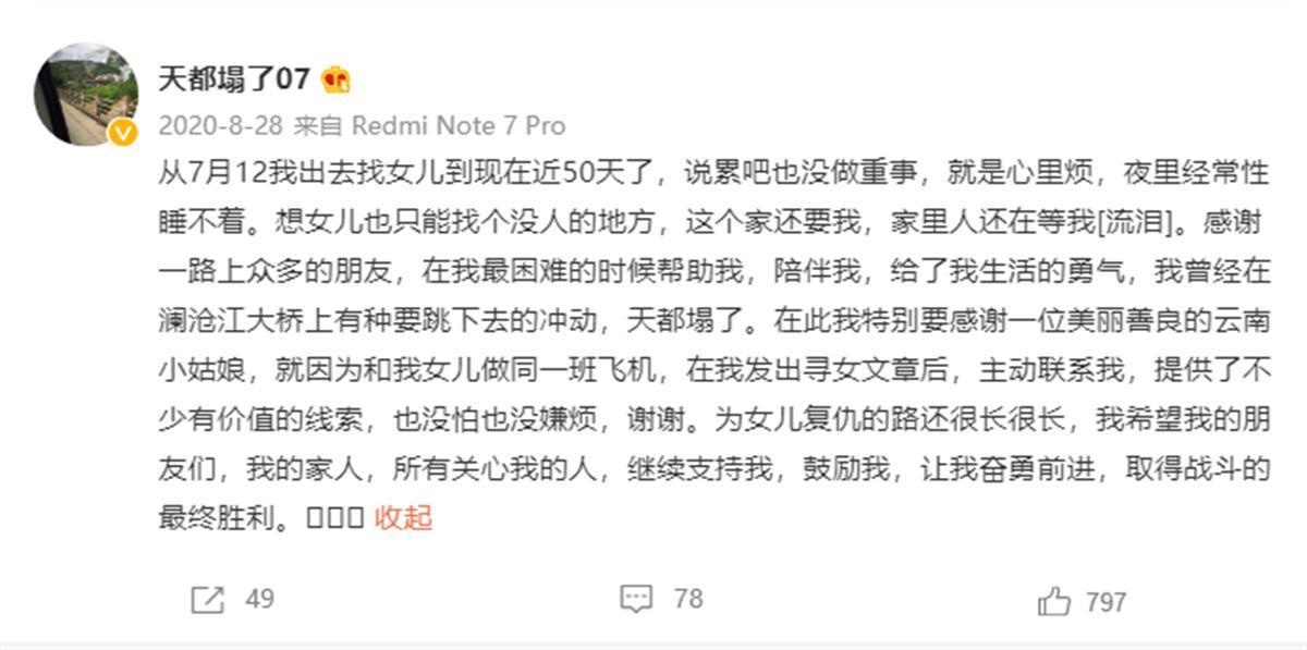 自独生女儿月月(化名)遇害后,原不熟悉网络的父亲李胜,摸索着开通了微博,他起名为“天都塌了”。“往后余生,我们只能生活在想念里。”女儿的意外被害,让李胜和他的爱人悲痛万分。