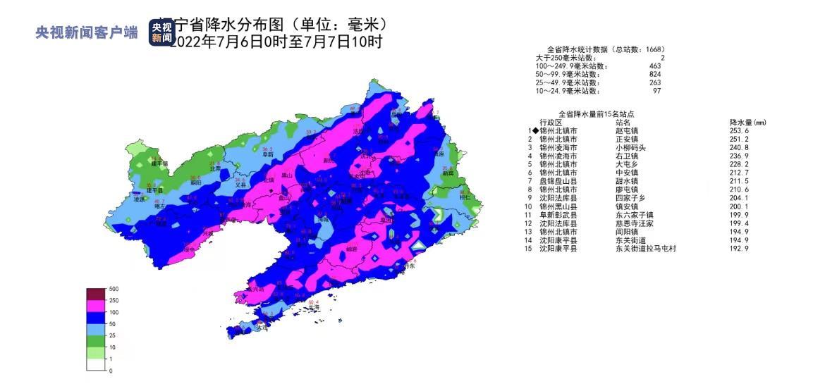 2022年7月6日0时至7月7日9时,辽宁省大部地区出现暴雨、局部大暴雨,最大降雨量253.6毫米出现在锦州北镇市赵屯镇。