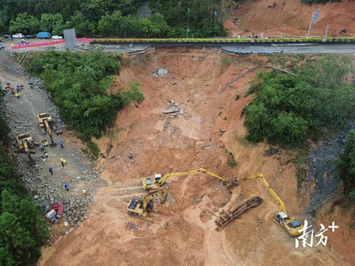 据南方日报7月5日下午在现场了解的情况,事故发生时有一辆货车因失衡后轮被悬空,另有一辆车坠入塌陷的泥土中,5日上午,后轮仍悬空的货车被吊走。