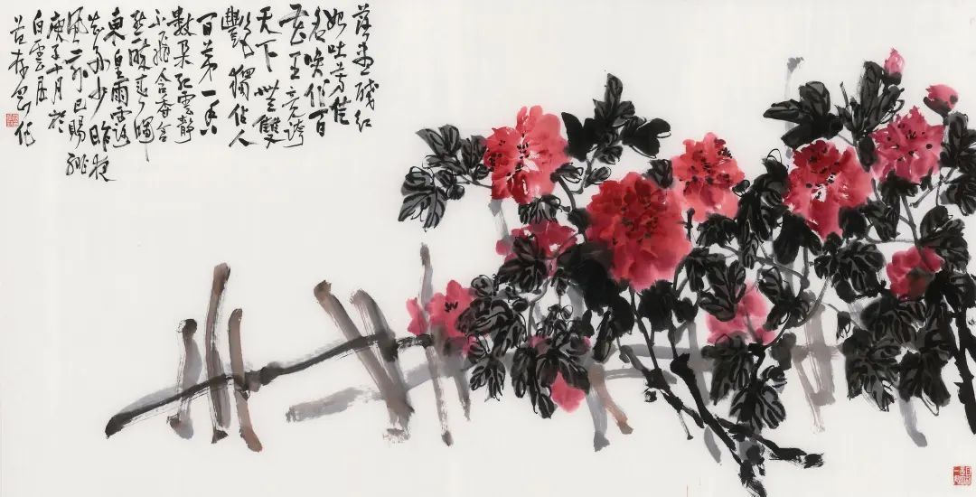 范存刚花鸟画属于大写意一路。“大写意”一说,溯源上自吴道子、梁楷、牧溪,近世则称吴昌硕、齐白石为翘楚。范君堪称是出色的后继。“大写意”顾名思义,“大”是首义。大非指尺幅之大,而是醉眼向天,解衣磅礴,直抒胸中块垒,虽盈尺之画,具百寻气象。杜甫有句“大城铁不如,小城万丈余”似可况之。
