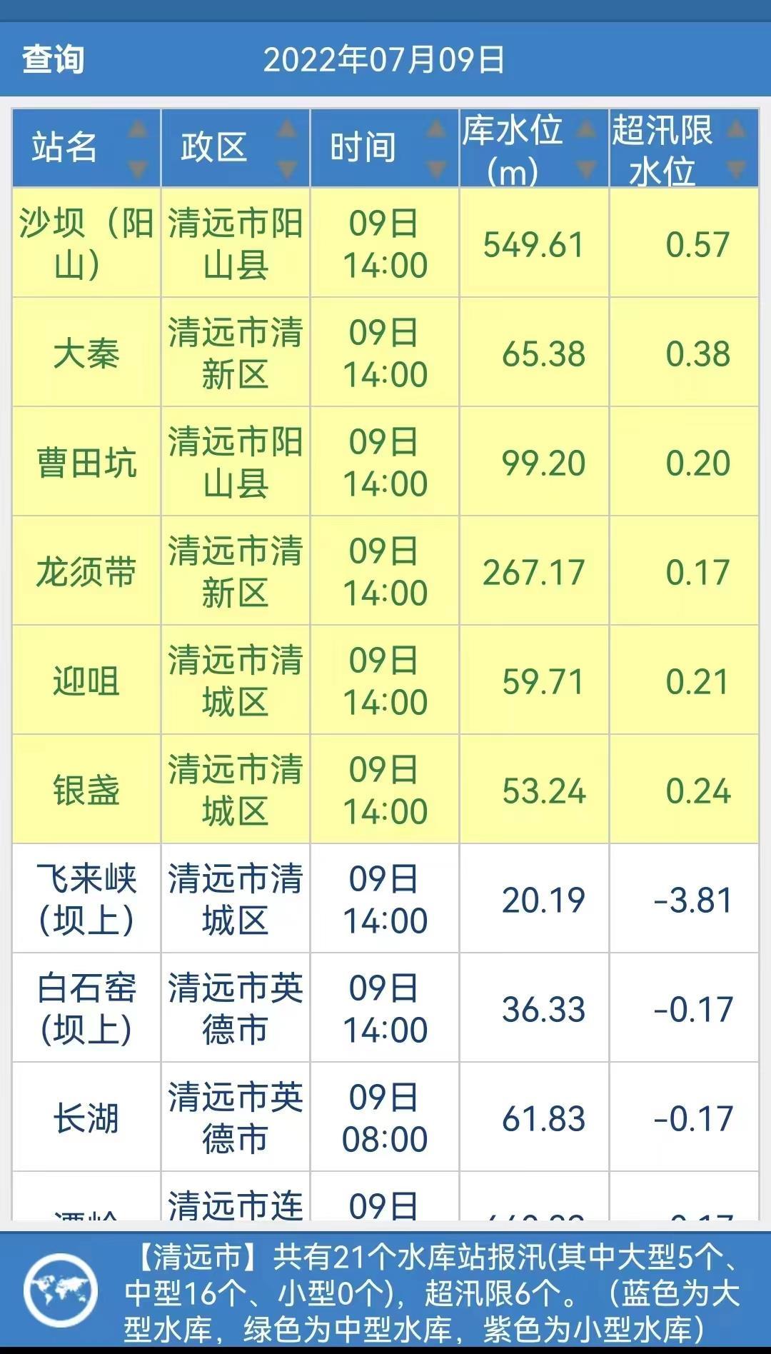 根据广东省水文局清远水文分局站点监测统计,截至7月9日14时,清城区大燕河源潭站水位14.94米,已经退至警戒水位以下。至此,北江流域所有河流水位均退至警戒水位以下。