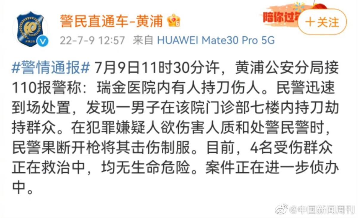 据上海市公安局黄浦分局通报,7月9日11时30分许,上海市公安局黄浦公安分局接110报警称:瑞金医院内有人持刀伤人。民警迅速到场处置,发现一男子在该院门诊部七楼内持刀劫持群众。在犯罪嫌疑人欲伤害人质和处警民警时,民警果断开枪将其击伤制服。目前,4名受伤群众正在救治中,均无生命危险。案件正在进一步侦办中。