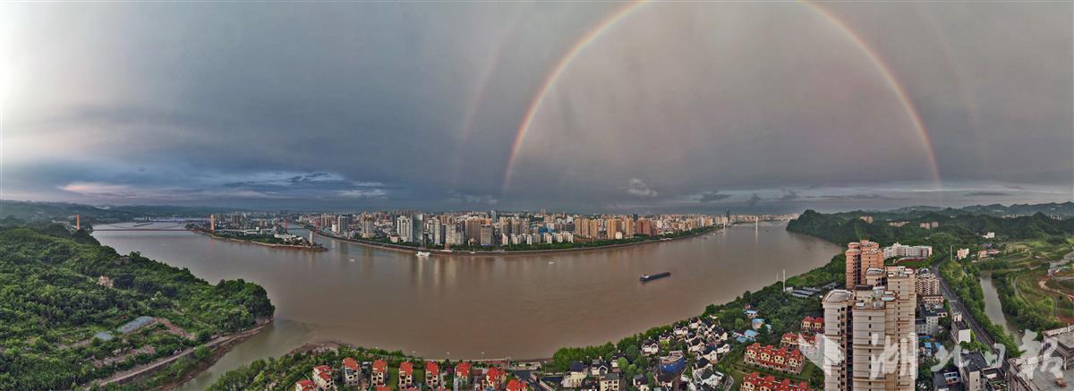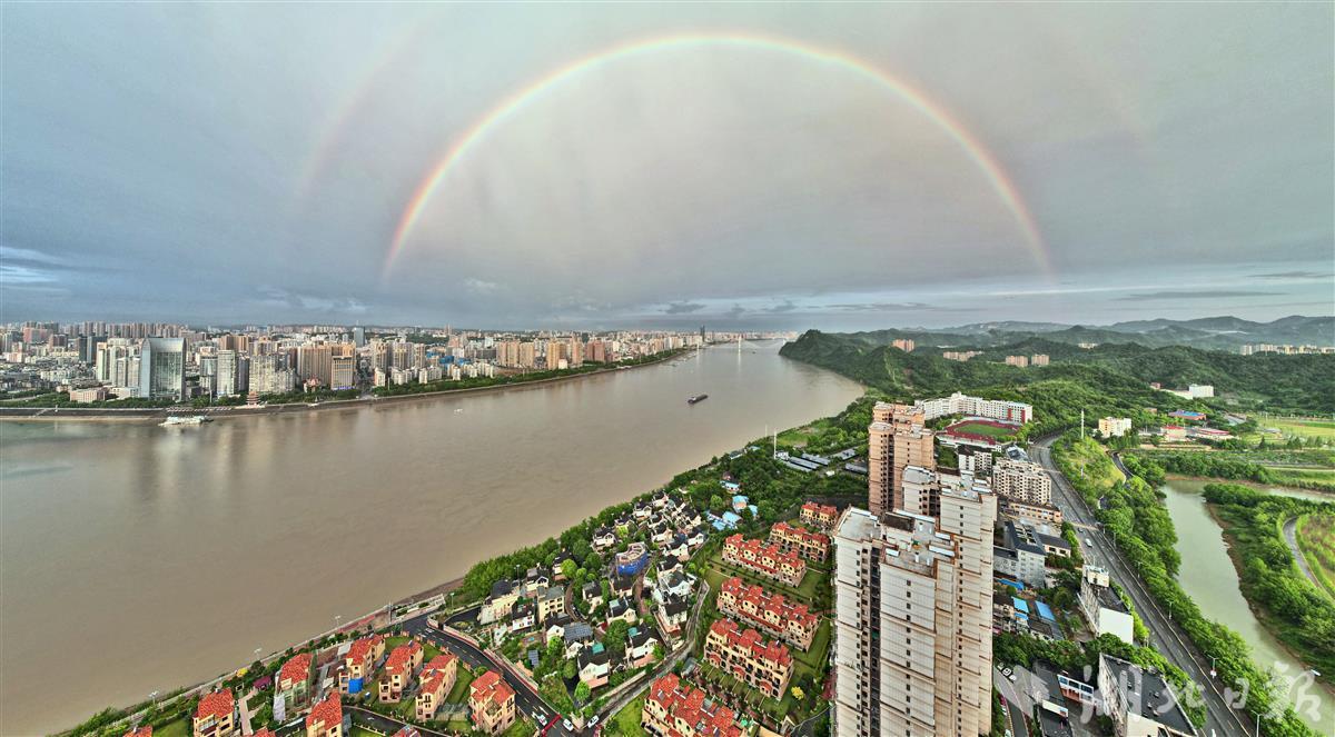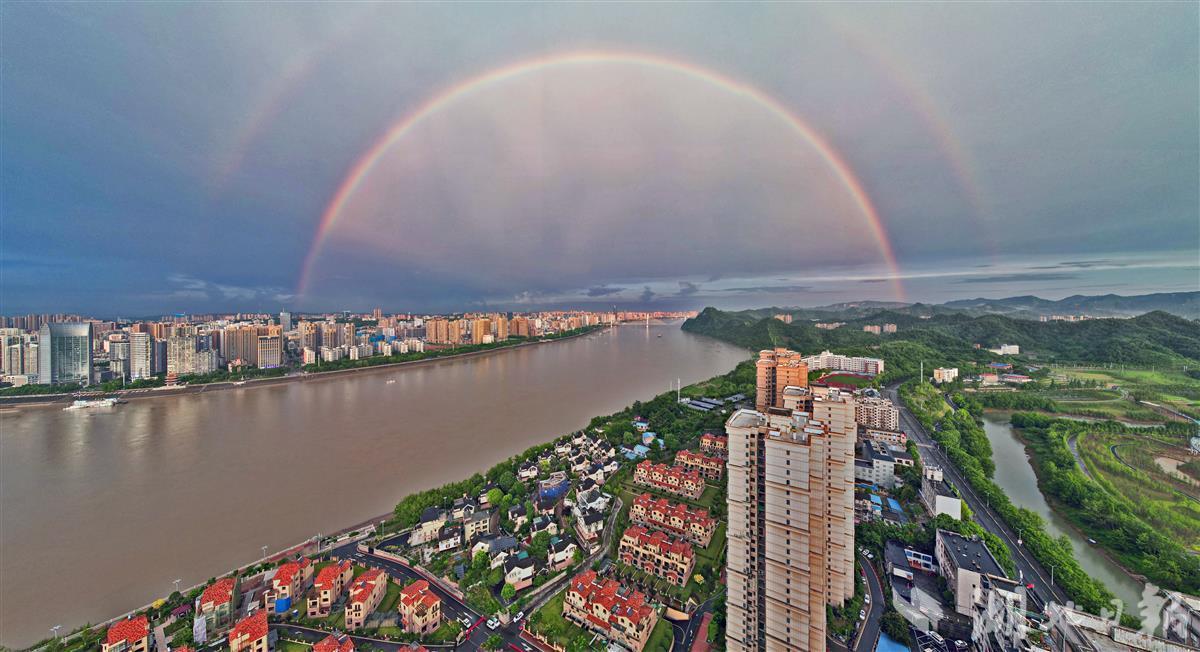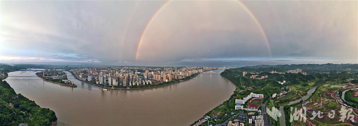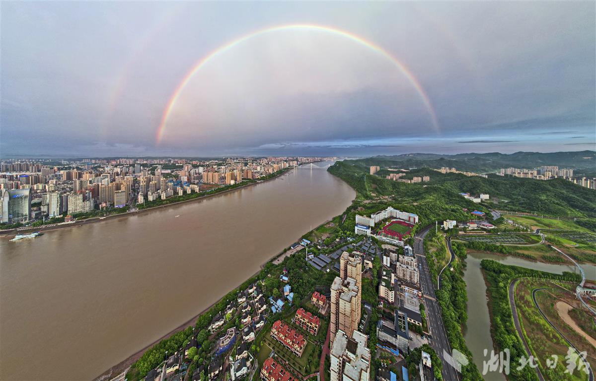 7月9日,结束了一场暴风雨之后,傍晚时分,长江宜昌段出现一道美丽的双彩虹摇挂在长江两岸,巨大的双彩色圆环连接天地,滨江城市无与伦比的美景让人陶醉。(湖北日报全媒记者刘曙松摄)