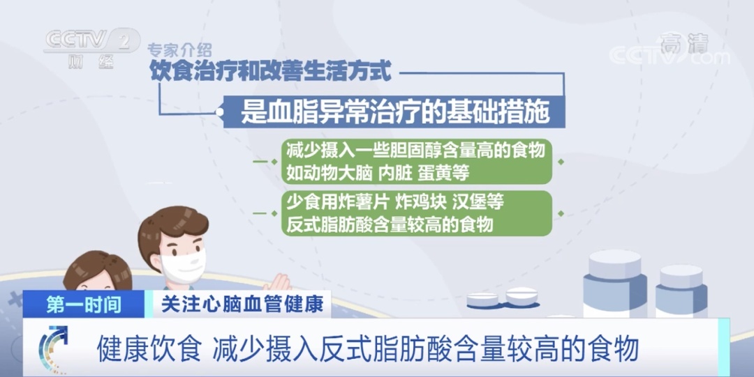 专家介绍,饮食治疗和改善生活方式,是血脂异常治疗的基础措施。减少摄入一些胆固醇含量高的食物如动物大脑、内脏、蛋黄等。少食用炸薯片、炸鸡块、汉堡等反式脂肪酸含量较高的食物。坚持规律的中等强度运动,戒烟、限酒。