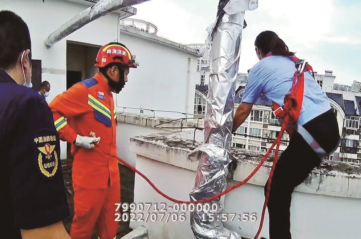 “阿姨下来陪你好不好,你不想回家,可跟阿姨去办公室,来阿姨家也行,我家里有个姐姐……”朱梅向女孩提到了自己正在读大学的女儿,朱梅和女儿的故事引起了女孩的好奇,两人便进一步聊了起来,女孩慢慢对朱梅信任起来。由于此时女孩只愿意和朱梅沟通,朱梅叫消防员把一套救援装备穿在自己身上,准备翻过护栏,到屋檐边和女孩谈心。
