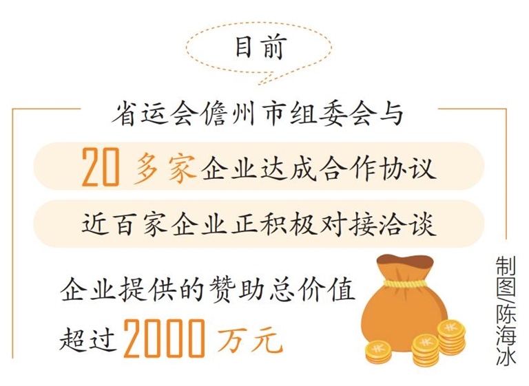 为何名企对省运会青睐有加?省运会儋州市组委会市场开发部副部长盛云认为,建设海南自贸港和推进儋洋一体化,为广大企业提供了广阔的发展机遇,省运会是企业展示形象、推广品牌的绝佳平台。他说,儋州市组委会按照“政府主导、社会支持、市场运作、合作共赢”的资源开发思路,向社会敞开大门,释放省运会优质资源,广泛搭建宣传展示平台,吸引了一批省内外知名企业参加,为省运会筹备工作提供了有力支持。据统计,目前,企业提供的赞助总价值超过2000万元。