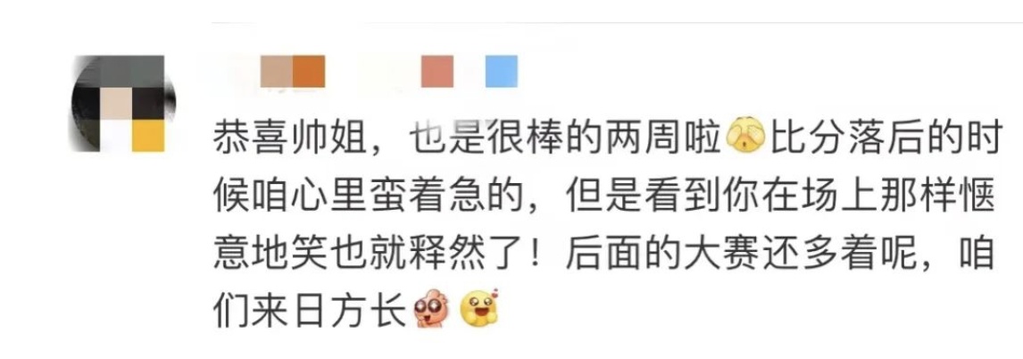 “比分落后的时候,咱心里也挺着急的,但看到你在场上那样惬意地笑,也就释然了。后边大赛还多,来日方长。”