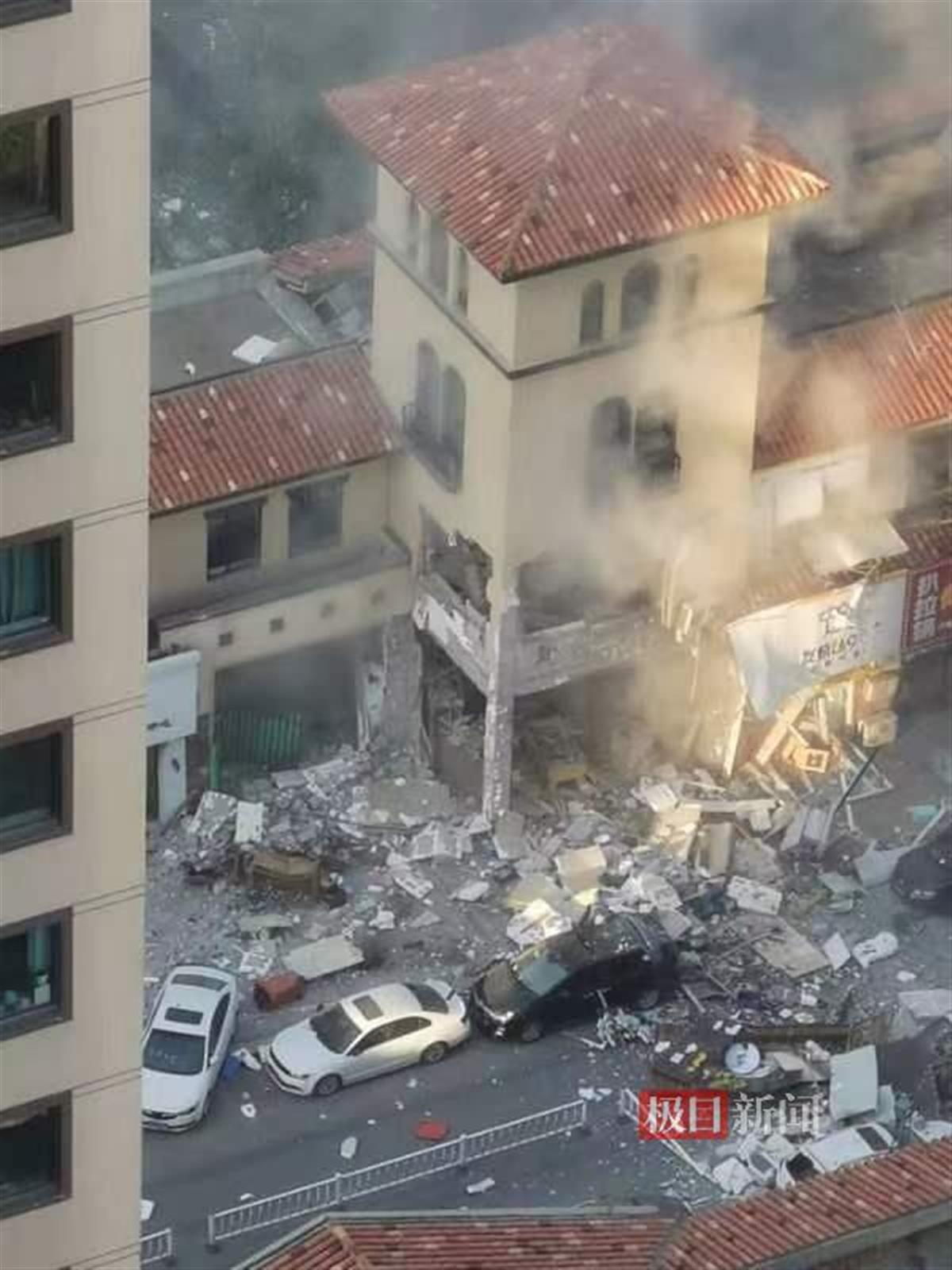 网上流传的视频显示,一栋4层临街建筑下面两层损毁严重,地上都是砖石等碎片。多辆停放在附近的汽车受波及,车身上落了不少灰尘、砖石等物,一辆白色小车被掀翻。网友称,事发地为长春市净月高新技术产业开发区中海净月华庭小区临街商铺。