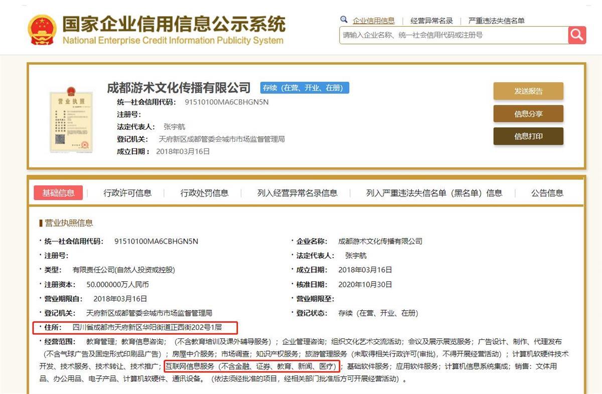 记者查询发现,谭乔提到的游术公司,系成都游术文化传播有限公司。国家企业信用信息公示系统显示,该公司于2018年03月16日成立,注册资本为50万元人民币,登记机关为天府新区成都管委会城市市场监督管理局,其经营范围包含知识产权服务、互联网信息服务(不含金融、证券、教育、新闻、医疗)等。