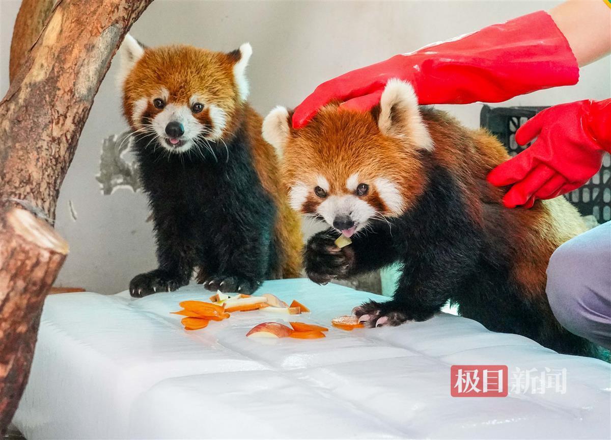 一旁的猎豹,与冰块为伴;饲养员将水果放在冰块上,这样小熊猫们可以品尝冰镇水果啦,小熊猫室内还有空调吹凉气。