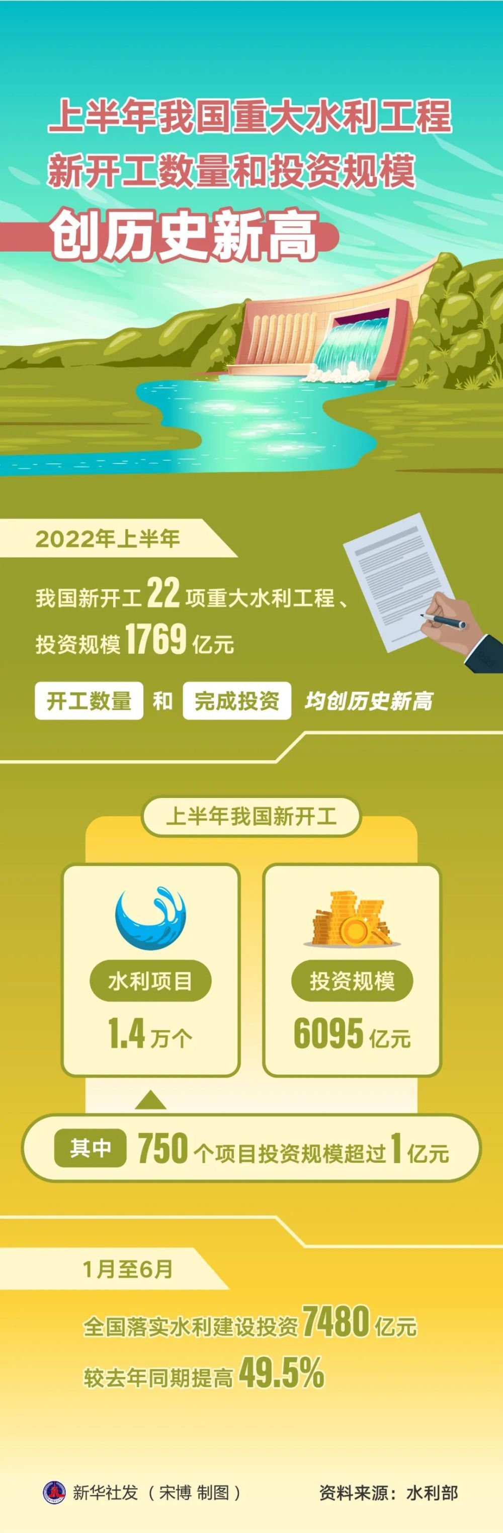 水利部消息,今年上半年,我国新开工22项重大水利工程、投资规模1769亿元,开工数量和完成投资均创历史新高。