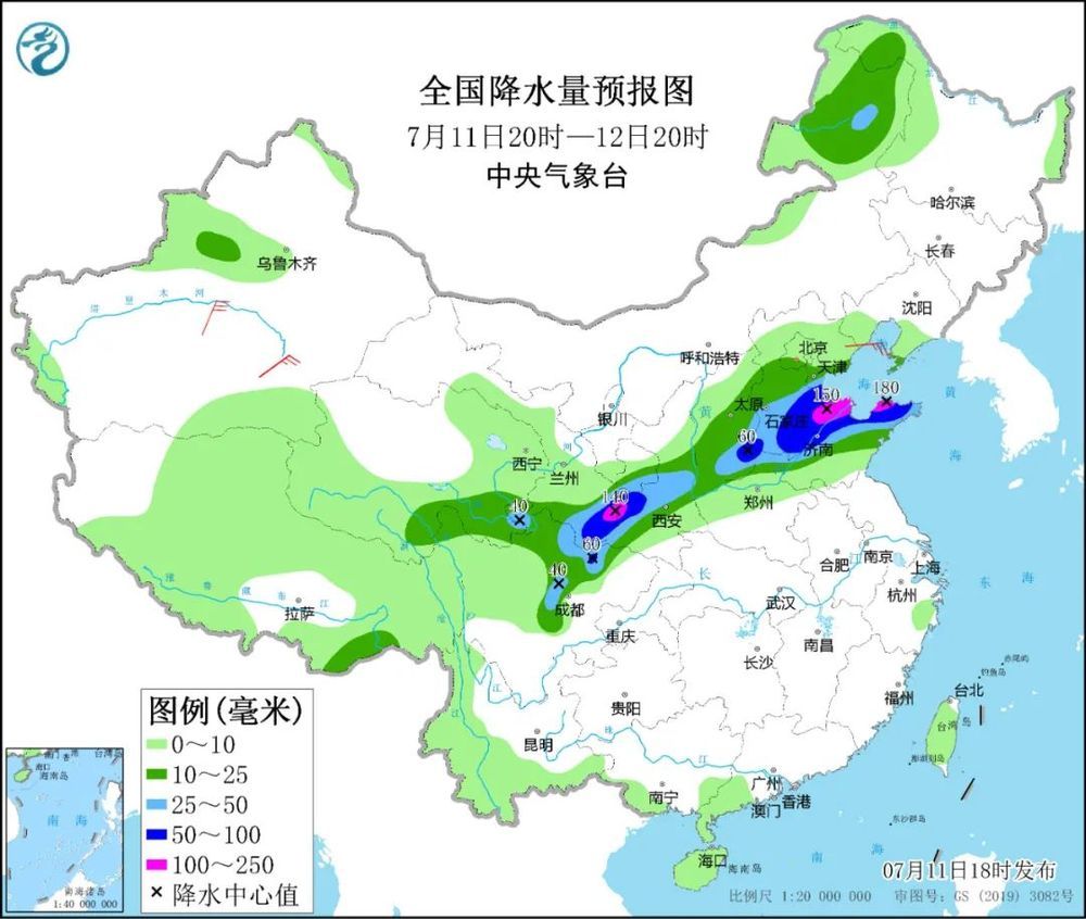 11日20时至12日20时,甘肃东南部、陕西中部和西南部、山西南部、河北中南部、天津南部、山东中北部、河南北部、四川盆地西北部等地部分地区有大到暴雨,其中,甘肃东南部、陕西西南部、山东北部和东部等地部分地区有大暴雨。