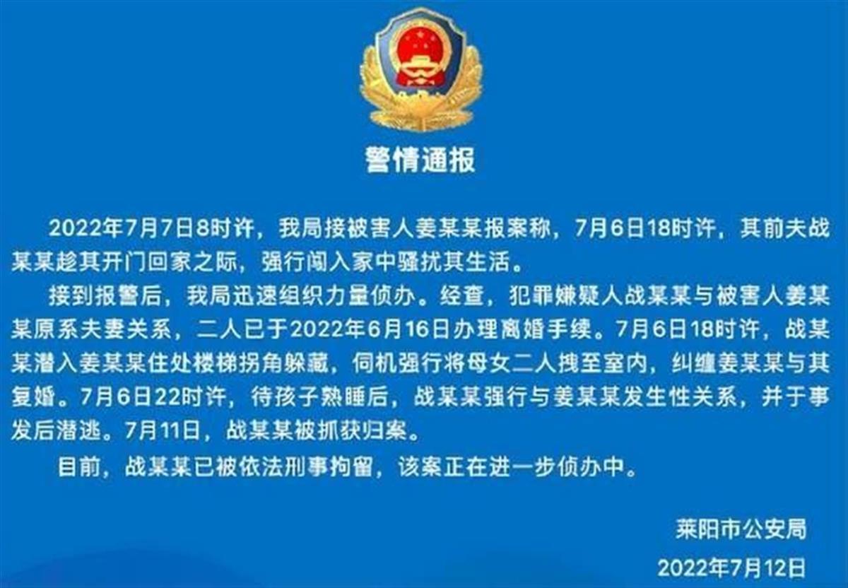 近日,一段疑似母女被男子拖进屋内的监控视频在网上流传,引发广泛关注。7月12日中午,山东莱阳市公安局发布“警情通报”,犯罪嫌疑人战某某是被拖拽女子姜某某的前夫,事发时系强行闯入女方家中,并强行与其发生性关系,目前战某某已被依法刑事拘留,该案正在进一步侦办中。(据7月12日极目新闻)