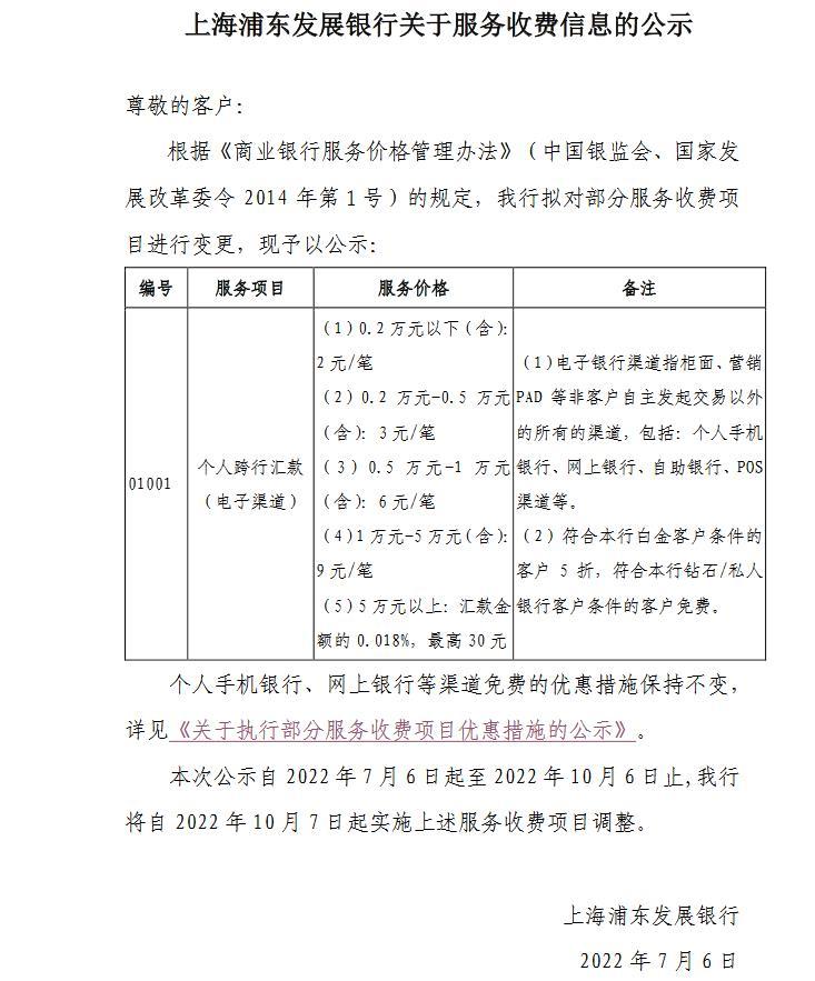 中新网7月12日电 日前,浦发银行发布的一则关于服务收费信息的公示显示,该行拟对部分收费项目的服务内容进行变更,电子渠道的个人跨行汇款将收取对应费用,引发关注。中新财经12日在该行官网注意到,此前发布的公告已更新,明确通过个人手机银行、个人网上银行、POS渠道办理个人跨行汇款业务免费的优惠措施保持不变。(中新财经)