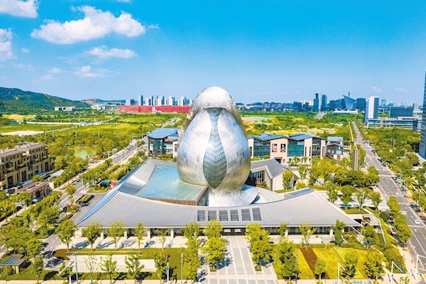 7月10日,武汉东湖高新区的建筑博物馆(中国建筑科技馆),在蓝天白云映衬下熠熠生辉。