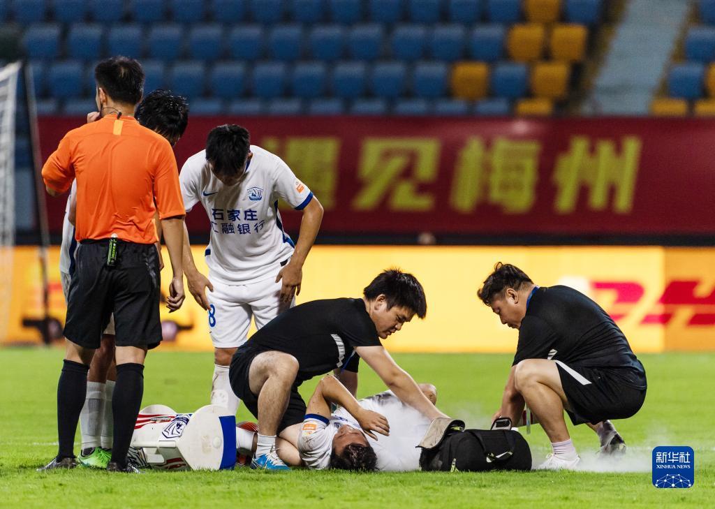 7月12日,沧州雄狮队球员林创益(下)在比赛中受伤。新华社记者 王冠森 摄